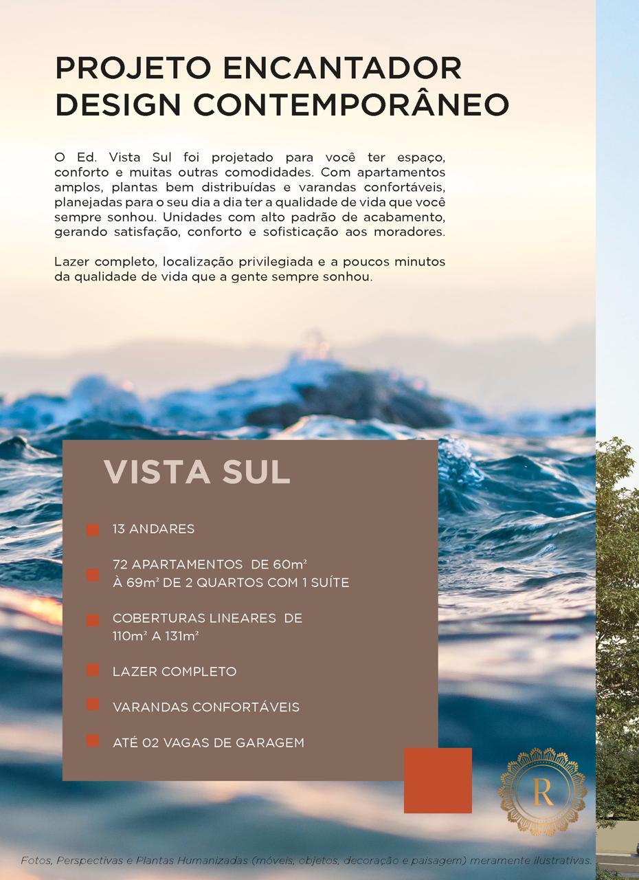 Uma nova vista para o seu futuro! O Vista Sul é o empreendimento perfeito para quem busca conforto e sofisticação em apartamentos de alta qualidade. 2 quartos com suíte de 60 a 69m² e coberturas lineares de 110 a 131m² Com opções de apartamentos amplos, com suíte e varanda, este é um investimento seguro e de certa valorização. O Vista Sul foi idealizado em cada detalhe para proporcionar bem-estar e o conforto que você e sua família buscam e merecem. Piscina Adulto e Infantil; Sauna; Churrasqueiras; Espaço Gourmet; Brinquedoteca; Home Office; Cross Training; Mini Quadra e mais! Saiba mais!
